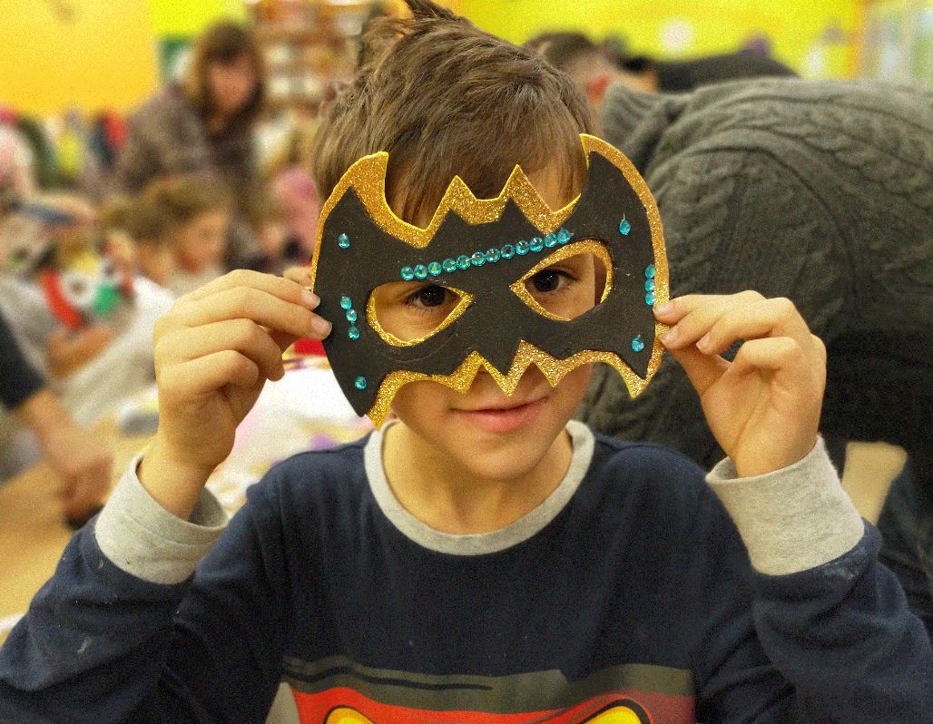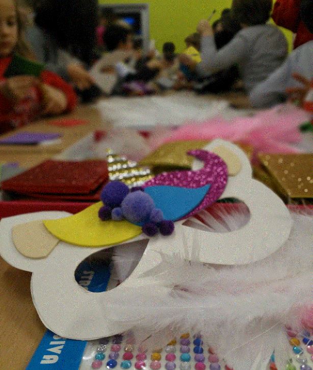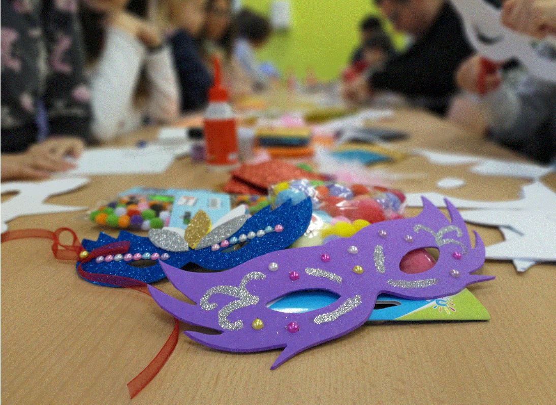 El taller va consistir en la realització d’una màscara realitzada amb goma eva; els nens i nenes podien triar entre 8 models (de fantasia, d’animals, de superherois…) i cadascú va poder personalitzar-la amb diferents elements: purpurina, plomes, brillants, pompons, etc.