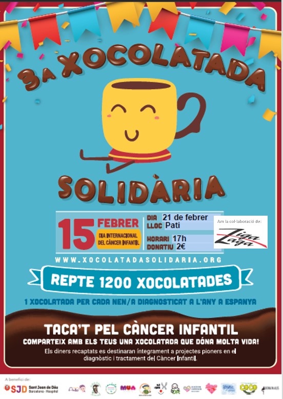 Recordeu que és una Xocolatada solidària, i tots els beneficis aniran destinats a L’Hospital de Sant Joan de Déu, per a la investigació del càncer infantil.