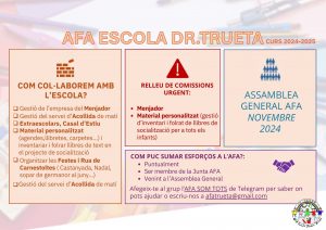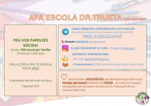 Al nostre web podeu renovar o fer-vos família sòcia de l’AFA Escola Doctor Trueta per al proper curs 2024/25 i disposareu del vostre CARNET VIRTUAL de família.