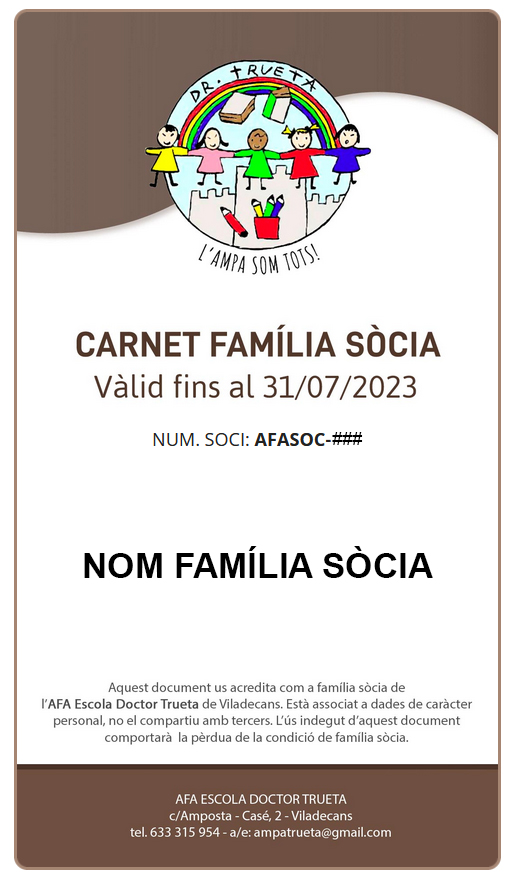 Enguany, amb la inscripció a l’AFA Escola Doctor Trueta rebreu el carnet de família sòcia de manera On-Line. Durant el curs anirem oferint avantatges que podreu aconseguir gràcies a aquest carnet.