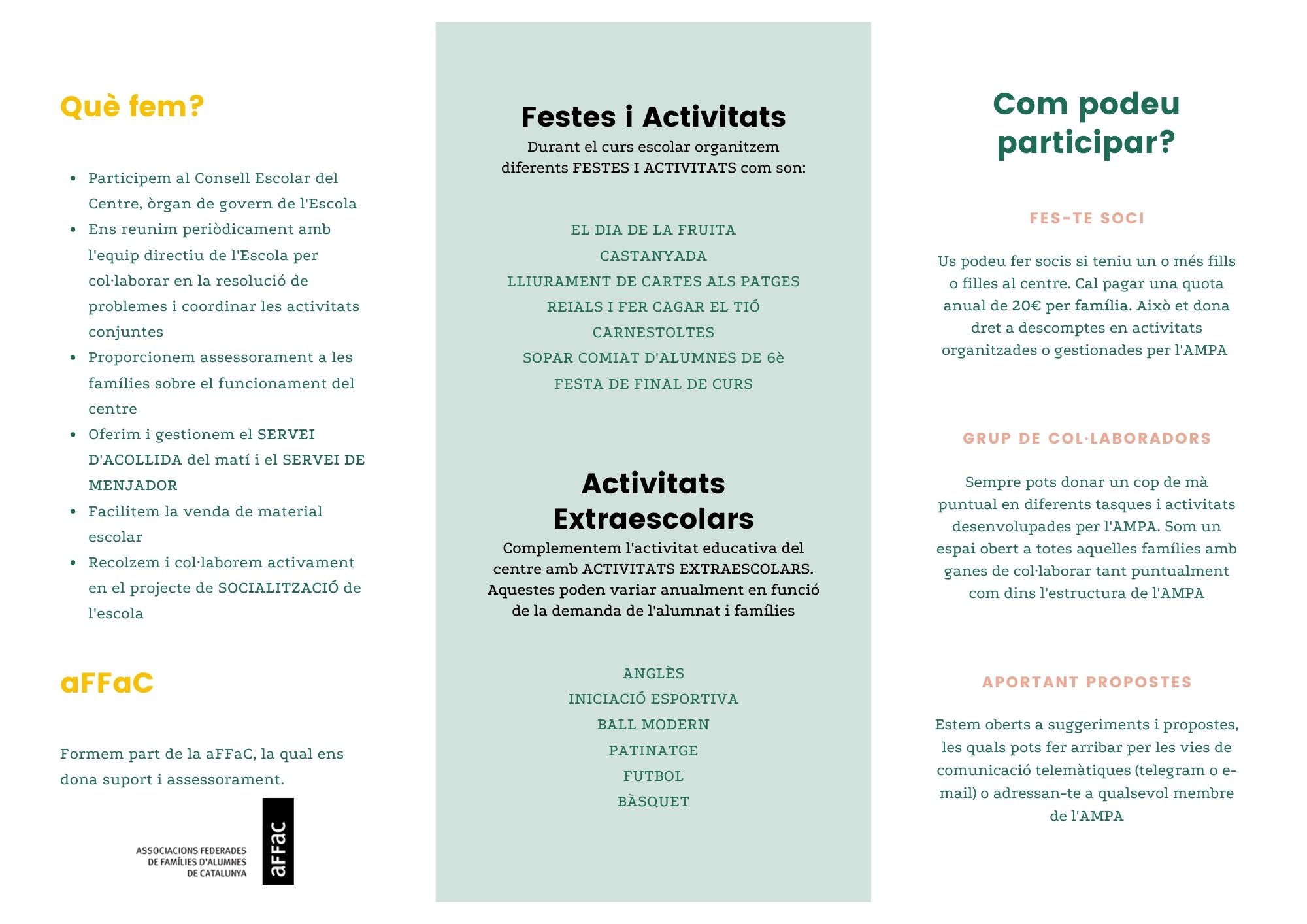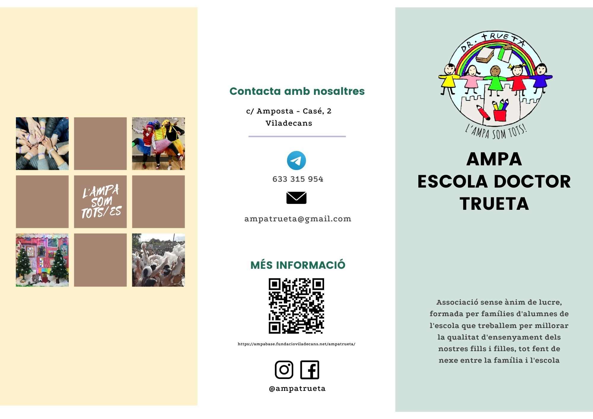 Del 21 al 25 de febrer son les portes obertes del Trueta. L’AMPA hi serem presents per a presentar-nos a totes aquelles famílies que s’han interessat en la nostra escola. Aquests són els tríptics amb que ens presentem